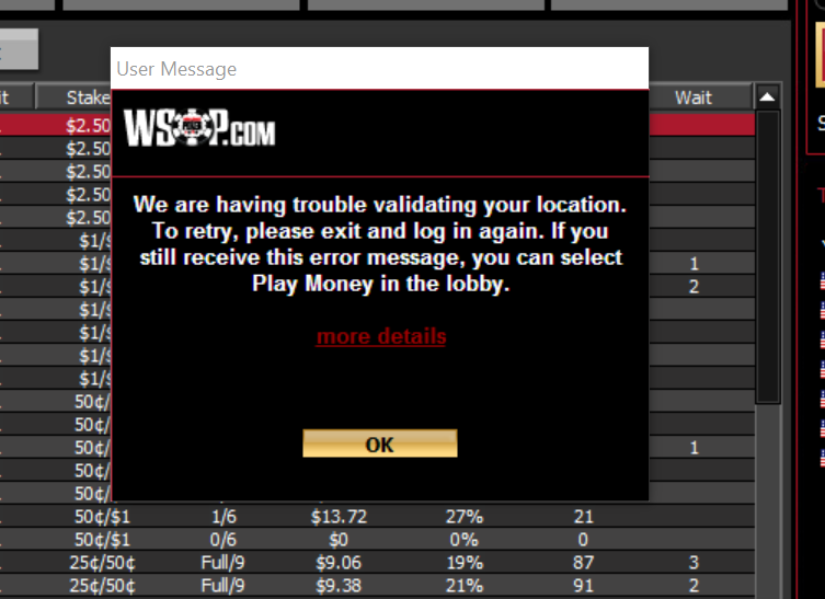 The Geo-location required by the regulations for online poker in Nevada had other plans. From my 5th floor room on the first 2 nights, I could no play longer than about 10 minutes before I received the dreaded could not verify your location message. Unlike a simple disconnect, this is more like a black screen of death. Any hand I’m involved in, I lose (or at best check/fold to river)* (update March ’17: This seems inaccurate currently and it now allows you to play any current hand out), and I’m instantly removed from all tables. So even if the geo-location problem is resolved 30 seconds later, I cannot win any hand I was involved in or keep my seat at a full table. The probability of this happening (1 in 10 minutes) while on the 5th floor made my expected value too low to attempt playing.